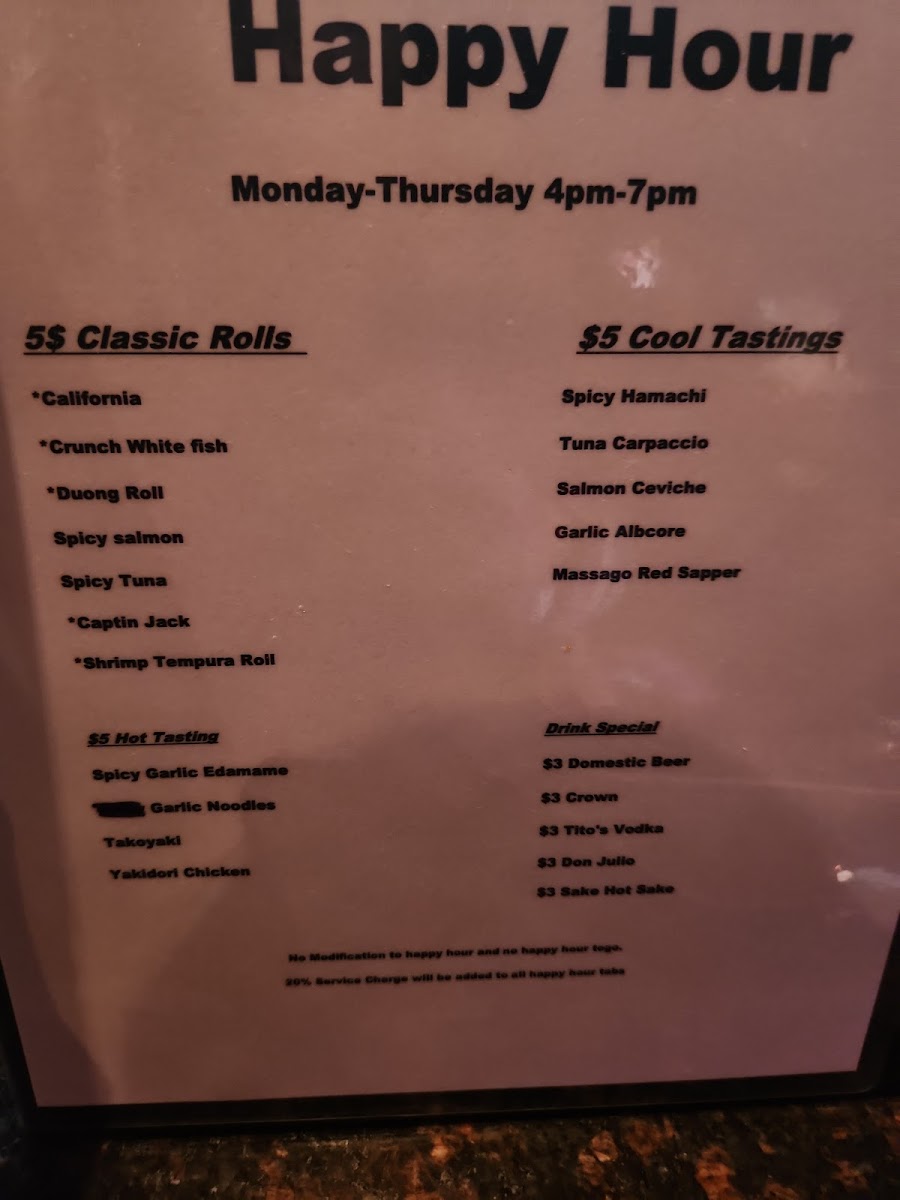 Shrimp tempura, crab stick, cucumber, avocado, topped with steak, jalapenos, crispy garlic and scallions w/ ponzu sauce